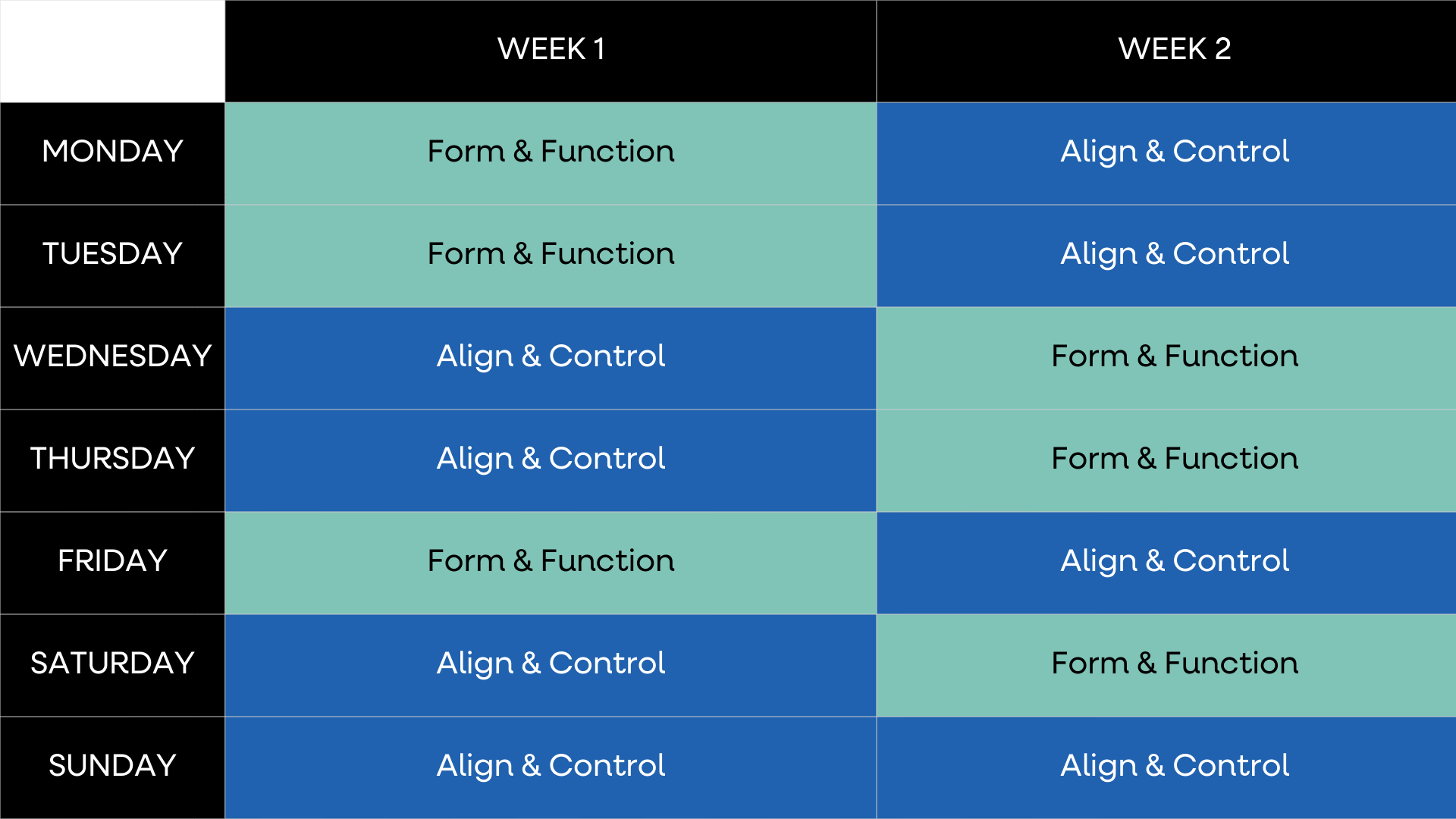 Each class now sits within either Form & Function or Align & Control, guiding your week in a way that feels balanced and supportive, not overwhelming.